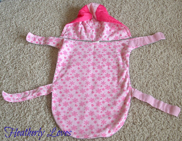 Next I took the straps on her winter coat and measured out 4 strips that will be used to wrap around the front of her neck and under her stomach. I pinned them right sides together sewed around them and left an opening to right side them out.