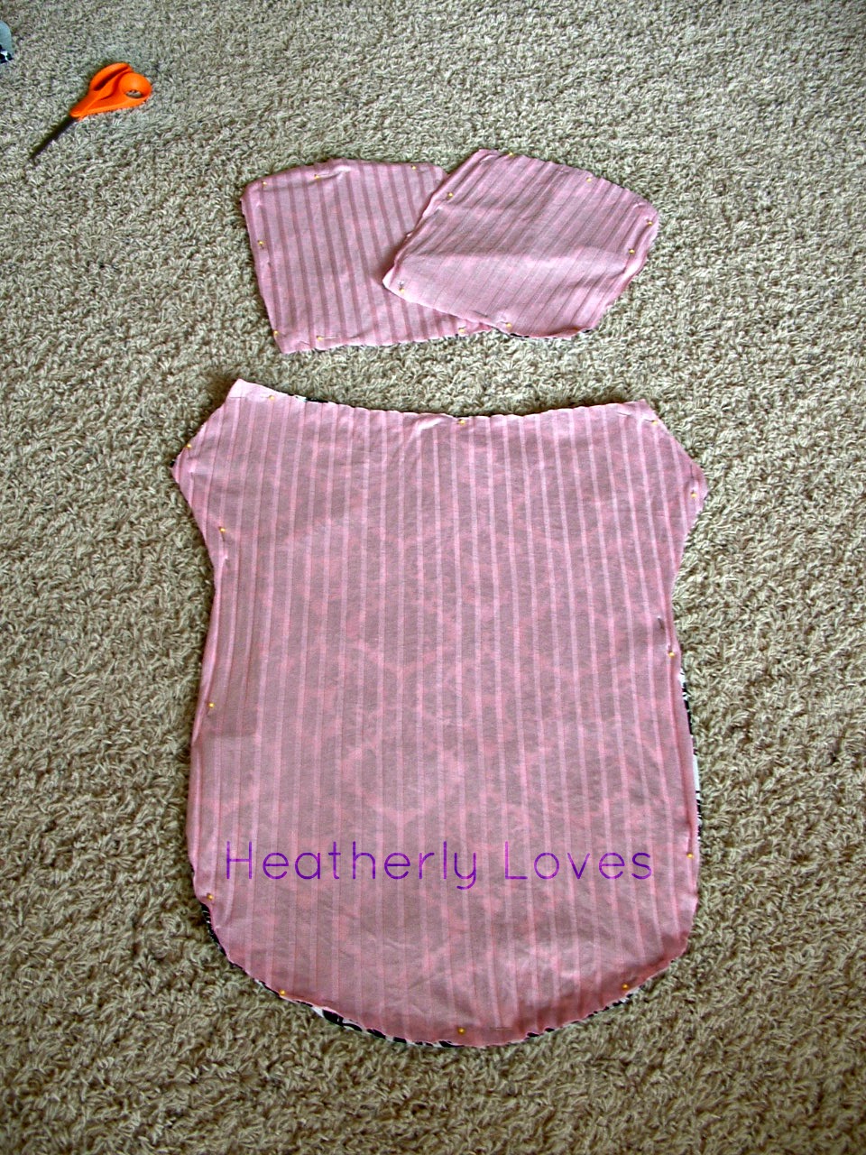 Now comes time to put all the pieces together. Now when you put the pieces in between the the two fabric. You are going to lay them matching to the sides of fabric they match. (did that make sense? If not let me know Ill help.) You are going to put the hood and two straps at the top. Then towards the bottom you will add the other two strips. Go ahead and sew around but leave an opening so you can right side it out.