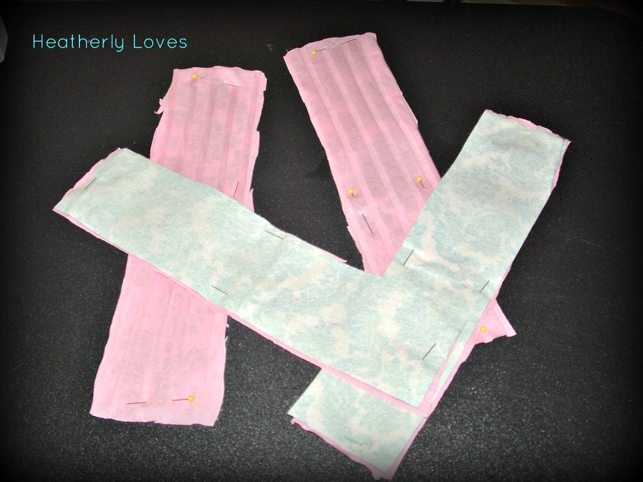 Then I took the other fabric I wanted on it and laid them together with right sides touching. Pinned the fabric together and cut out the other pieces. The pink I used was a very movable jersey... I didn't like sewing with it very much. But I was making this what I already had at home.