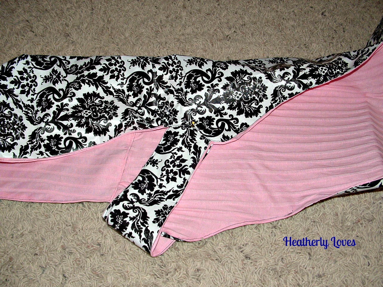 Once I did my top stitch I put it on Jewel and pinned the front straps where they were comfortable for her. Then eyed the back straps to wrap under her belly. I left the pins in and lifted the coat over her head, Maizy sure wanted to play at this point and it made it tricky not to poke Jewel.